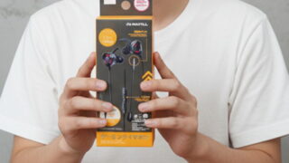 ダイソーのゲーミングイヤホンの箱を持っている
